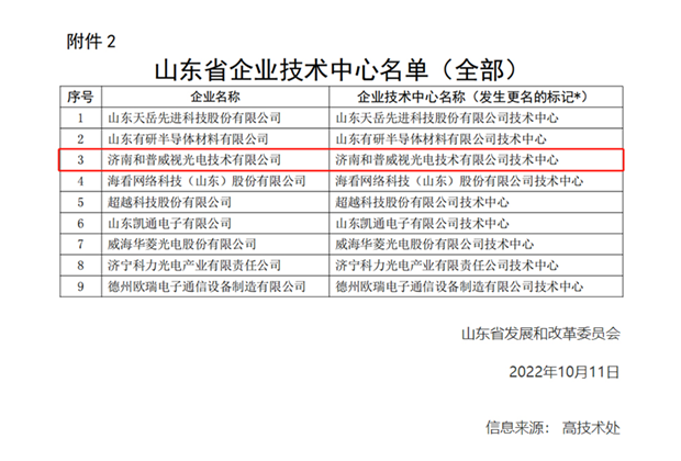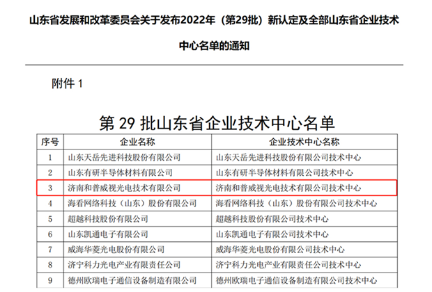 2022年10月11日,山東省發(fā)展和改革委員會(huì)發(fā)布通知:根據(jù)《山東省企業(yè)技術(shù)中心認(rèn)定管理辦法(2021年修訂)》(魯發(fā)改高技〔2021〕428號(hào)),經(jīng)審定,確認(rèn)162家企業(yè)技術(shù)中心自通知發(fā)布之日起具有省企業(yè)技術(shù)中心或分中心資格,濟(jì)南和普威視光電技術(shù)有限公司成功獲評(píng)。
